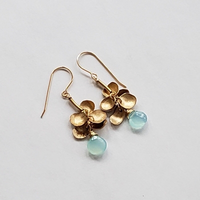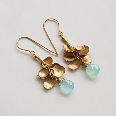 Gorgeous blue chalcedony earrings, hand forged gold petals.