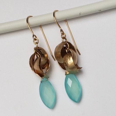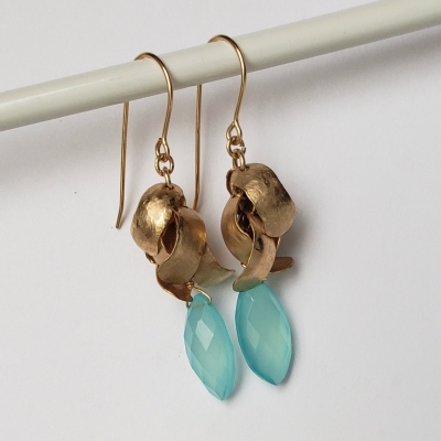 Blue chalcedony earrings, gold petals, 14k gold filled. E262