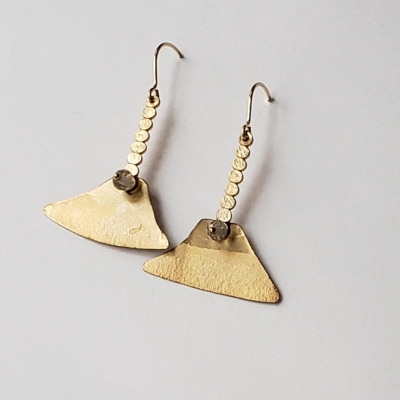 Golden fan shaped earrings with labradorite bead.