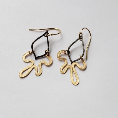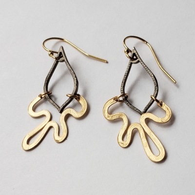 Oxidized silver leaf draped and golden leaf earrings, 14k g.f.
