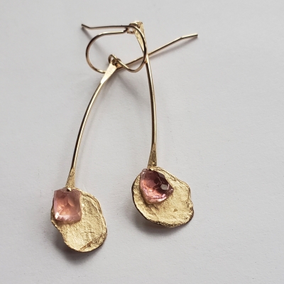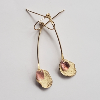 Pink tourmaline earrings with hand forged corn flakes, 14k gold filled.